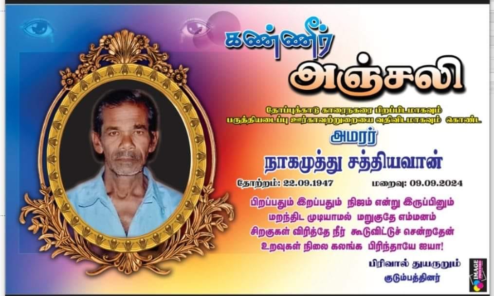 HomeMemorial Dayநாகமுத்து சத்தியவான் மறைவு 09-09-2024 Posted in Funeral Memorial Day Thoppukkadu நாகமுத்து சத்தியவான் மறைவு 09-09-2024 Posted on September 9, 2024November 3, 2025 by Programs Thoppukkadu