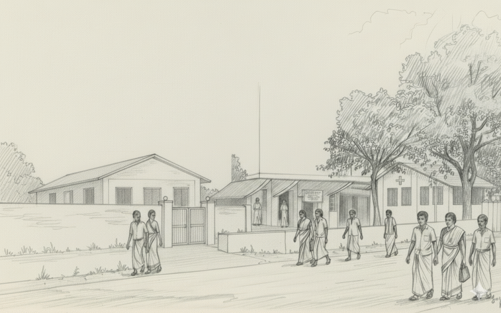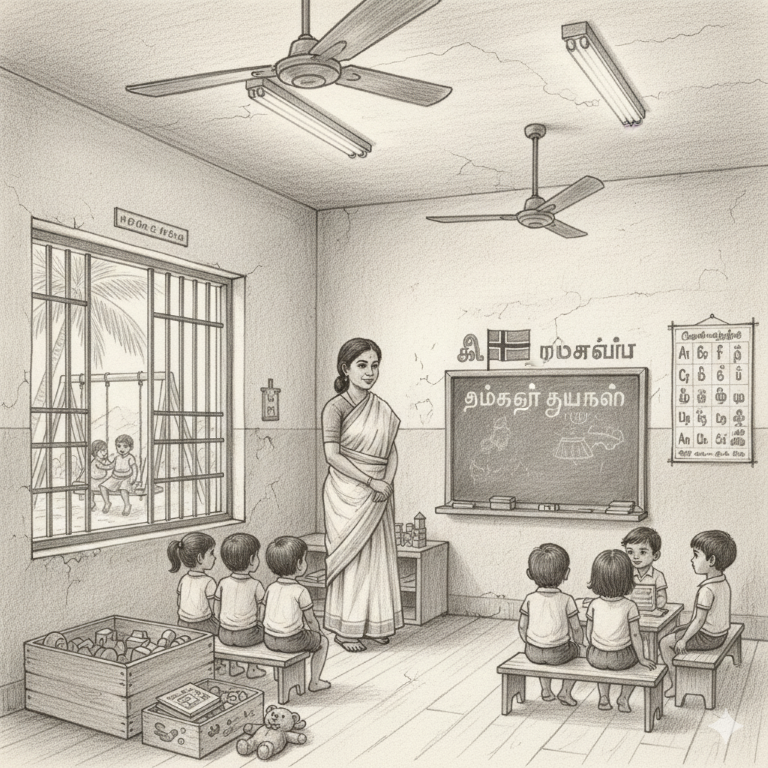 In the early 1980s, Thoppukkadu was home to a nursery school located inside the Jetty Hospital, funded by the Norwegian NGO FORUT. Children entered through the hospital’s entrance and were welcomed by Lally Teacher, a beloved figure in early childhood education.