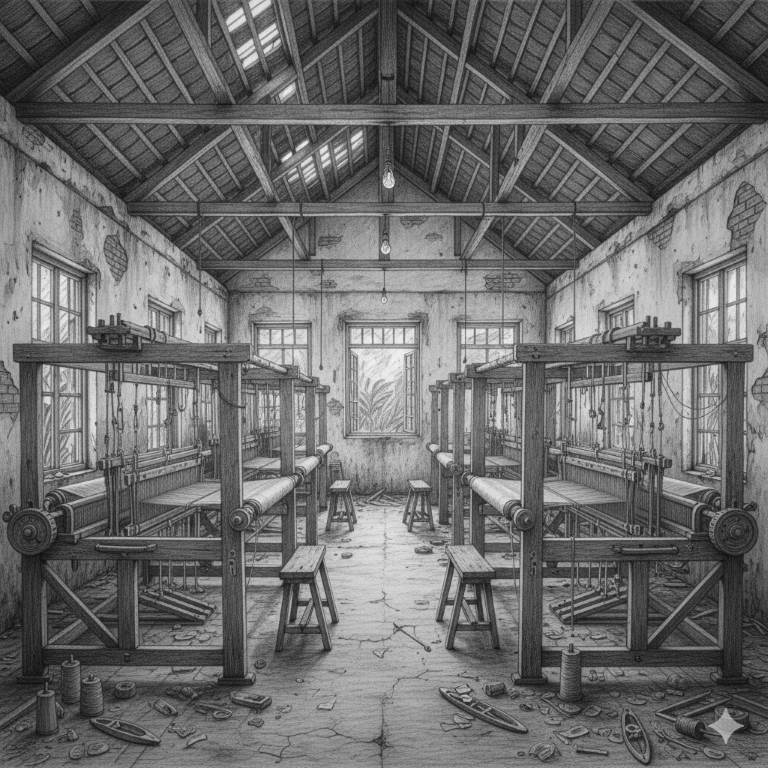 Near the Murugan Temple and Maraignanasampatha School stood a handloom factory housing Jacquard looms. Possibly supported by FORUT, it provided employment and vocational training, especially for women and youth.